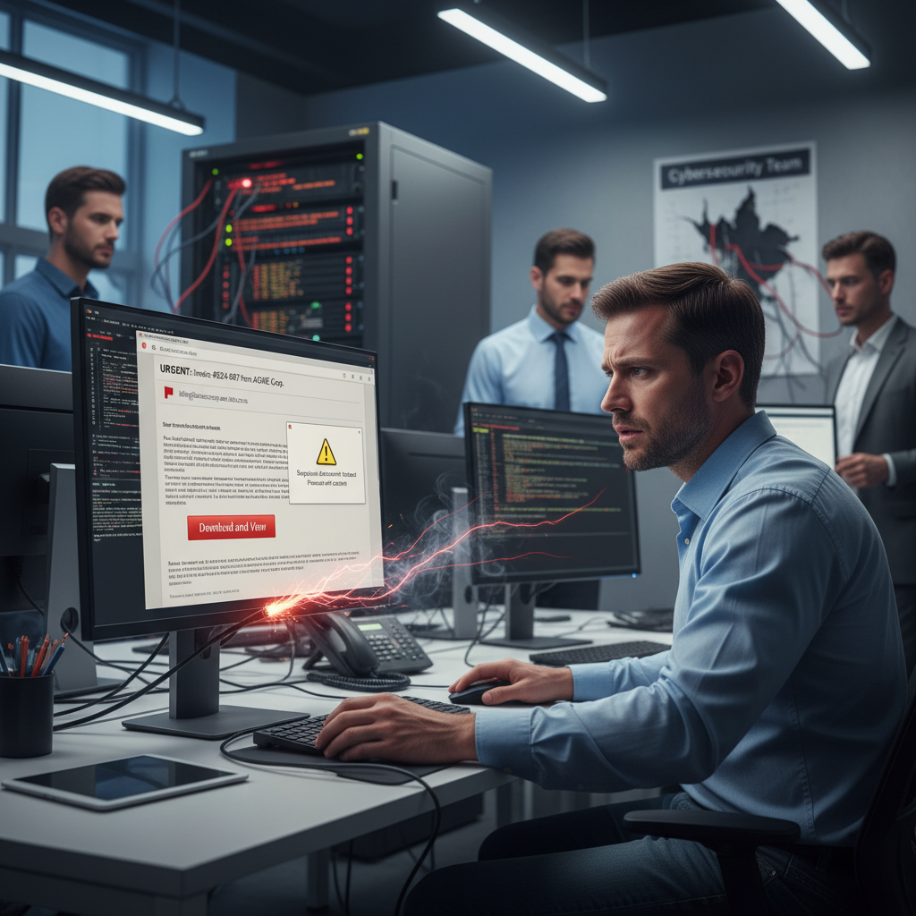 - Klikanie w linki phishingowe: Fałszywe faktury, alerty z banku czy pilne maile od „prezesa” są codziennością skrzynek służbowych.
