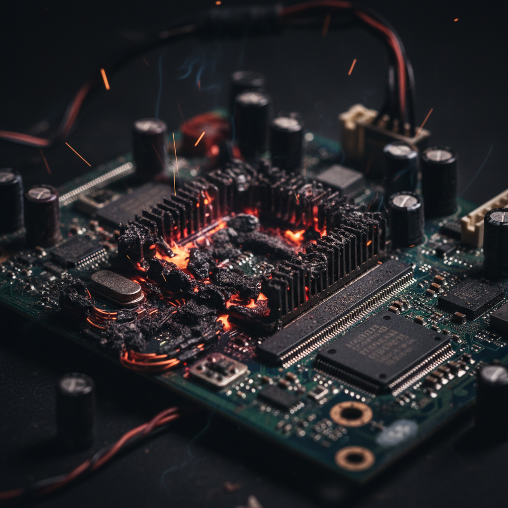 Uszkodzona płyta główna z widocznymi śladami przepalenia, komputer się nie włącza co zrobić
