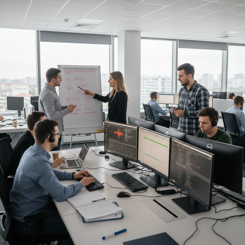 Zespół IT analizujący błędy systemu rozpoznawania mowy – spektakularne porażki są kluczem do doskonalenia technologii.